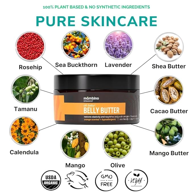- SAFE & PURE: This tummy butter is designed for all skin types including the most sensitive skin. Each product is made with certified organic plant oils, herbs, and flower extracts; without parabens, SLS or any synthetic preservatives, and without fragrances, emulsifiers and petroleum based ingredients