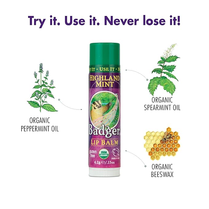 - One 0.15 ounce tube of badger balm highland mint lip balm