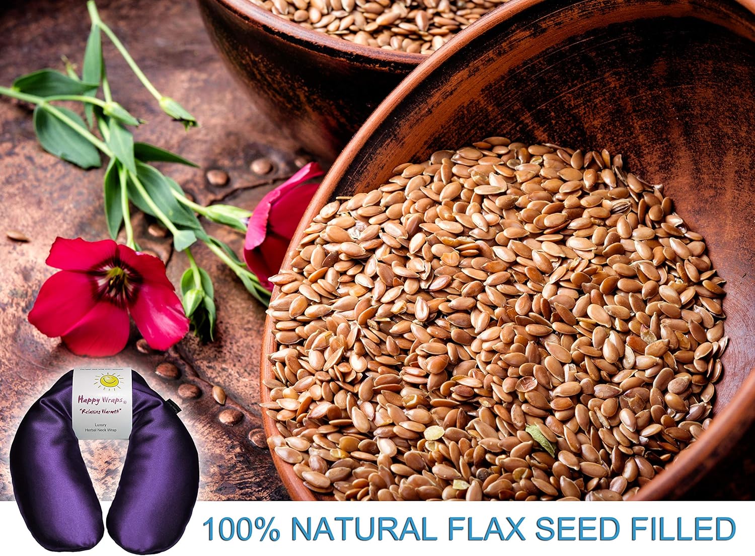 Microwavable Herbal Neck Wrap - Hot Cold Aromatherapy Neck Warming Pillow - Heating Pad for Migraines, Stress, Gifts for Women, Birthdays, Christmas and Free Sleep Mask - Amethyst Satin