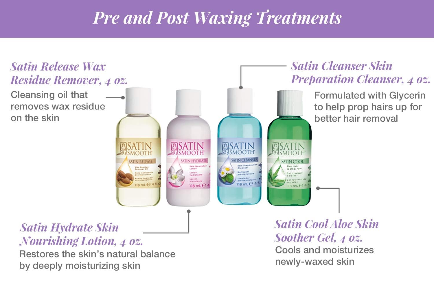 - 14 Oz. Deluxe Cream Wax, Sensitive Formula For Facial And Body Waxing. 4 Oz. Satin Cleanser Pre-Depilatory Cleanser. 4 Oz. Satin Release Post-Depilatory Calming Oil. Note: Do not place or drop into water or other liquids 4 Oz. Satin Cool Post-Depilatory Cooling Gel. 4 Oz. Satin Hydrate Post-Depilatory Lotion.