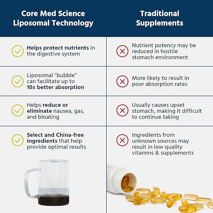- MAXIMUM ABSORPTION LIPOSOMAL TECHNOLOGY: Unlike traditional pills and liquids, where the active ingredients get destroyed by acids in the digestive tract, Core Med Science uses Liposomal Technology to protect nutrients with a liposomal “bubble” to safely deliver nutrients into the bloodstream for optimal absorption. Provides up to 80% more absorption and is also gentler on your stomach.