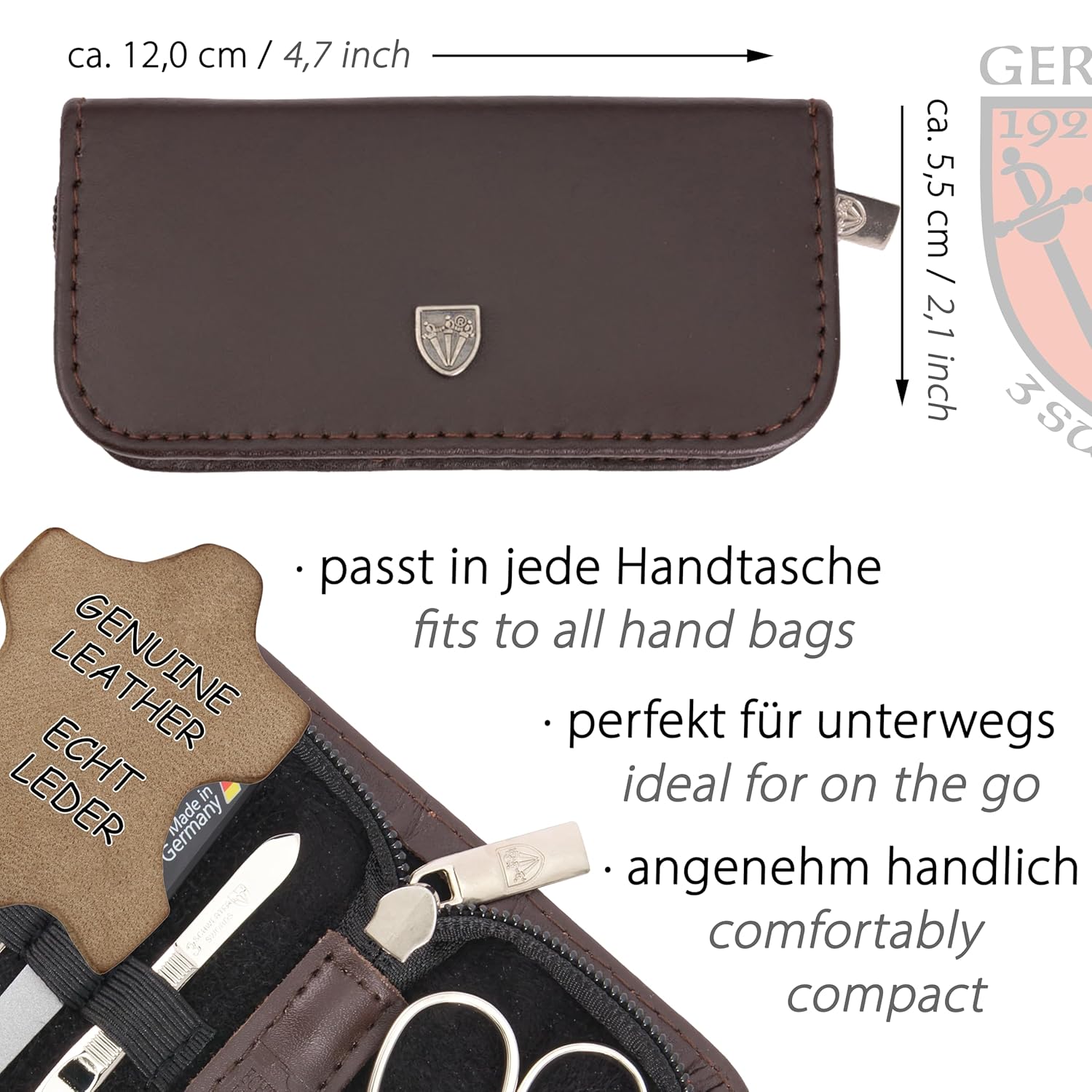 - CASE: Genuine leather brown, size ca. 12,0 x 6,0 x 3,0 cm. Our organizers are made of high-grade fashion or classic materials. Additional equipment: Microfiber cleaning cloth for cleaning steel items, general info sheet “Finger - Nail Grooming”.