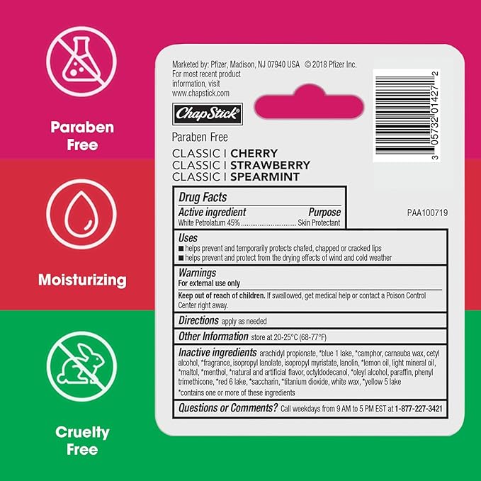 - CHAPSTICK FAVORITES: The Classic Collection variety 3-pack includes our Spearmint, Cherry, and sheer-tinted Strawberry lip balms.