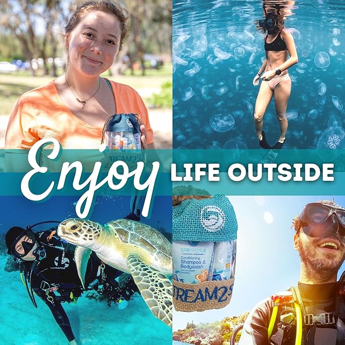 - Reef Safe, Biodegradable Travel Sized Gift Set; Our natural products are safe for use while camping and boating and is perfect for travel. Set Includes 1oz Travel Size Shampoo, Leave In Conditioner, SPF20 Sunscreen, SPF30 Tinted Mineral Sunscreen & Sting Relief Gel