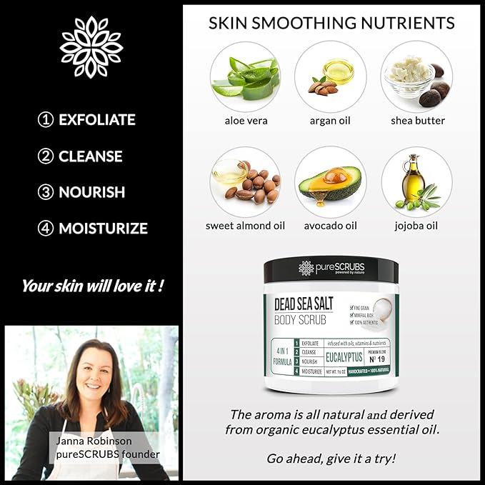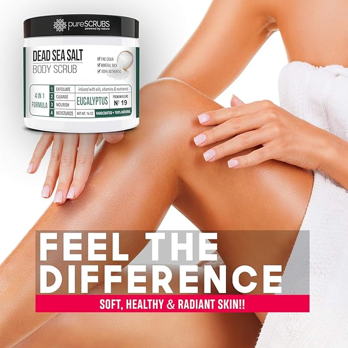 - GET ULTRA SMOOTH SKIN FAST - THIS WORKS! Our unique “4 in 1 Formula” does everything a body scrub should do and more - EXFOLIATE, CLEANSE, NOURISH & MOISTURIZE. Fine grain dead sea salt infused with essential oils, nutrients and skin softeners helps to smooth away rough, bumpy, and uneven textures to instantly reveal your true soft, healthy and radiant skin. You'll love the eucalyptus aroma!