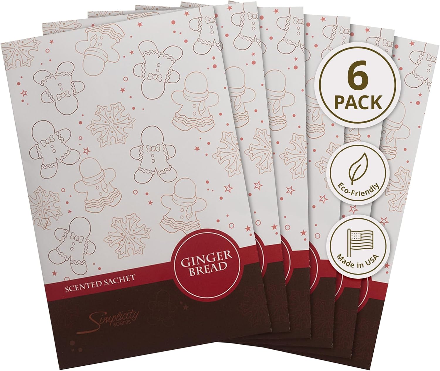 Simplicity Scents Gingerbread Scented Sachets Pack of 6, Fall & Winter - Long-Lasting Scented Bags, Home Fragrance, Air Freshener & Deodorizer for Closet, Room, Drawer, or Cars, Made in USA