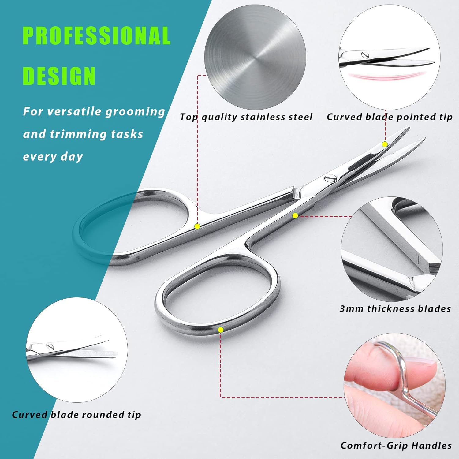 - Easy To Use - Curved blade with rounded tip curves away from skin for safety grooming. Extra curved blade with sharp pointed tips for precision trimming. Ergonomic design with large finger loops provides added control.