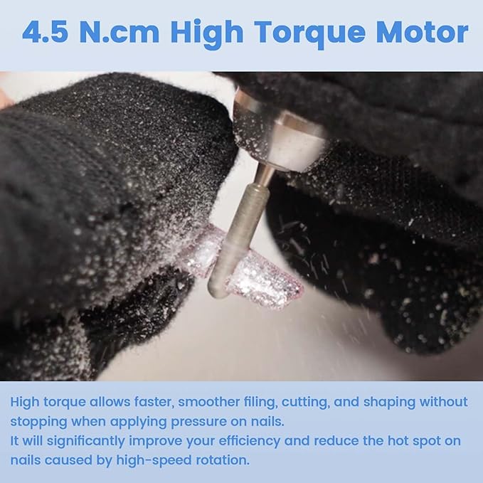 - Exclusive High-Torque Motor: The industry-leading 0.46 kgf.cm (4.5 n.cm) high torque motor enables the Delanie e-file nail drill to smoothly file off any nail products and shape any artificial nails without stopping on nails. 0.34 kgf.cm measured on the nail drill bit