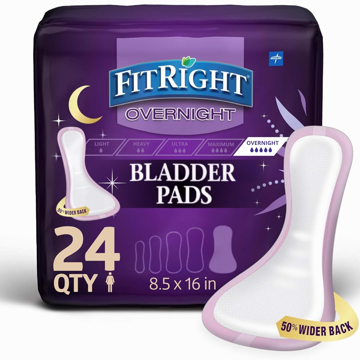 Medline FitRight Overnight Bladder Control Pads, Maximum Absorbency, Nighttime Incontinence Protection, 8.5 x 16, 24 Count per Bag (1 Bag)