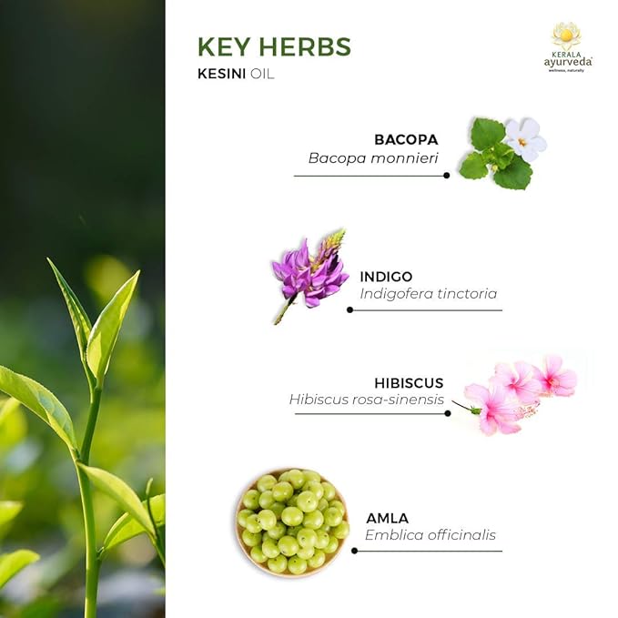 - DEEP NOURISHMENT FOR STRONGER, HEALTHIER HAIR: Kerala Ayurveda Kesini Oil supports hair and scalp wellness with a powerful Ayurvedic blend including Castor Oil, Coconut Oil, Bacopa (Bacopa Monnieri), Hibiscus (Hibiscus Rosa-Sinensis), Amla (Embelica Officinalis) and Indigo (Indigofera Tinctoria). It helps nourish the scalp and roots, promoting stronger, shinier hair with consistent use.