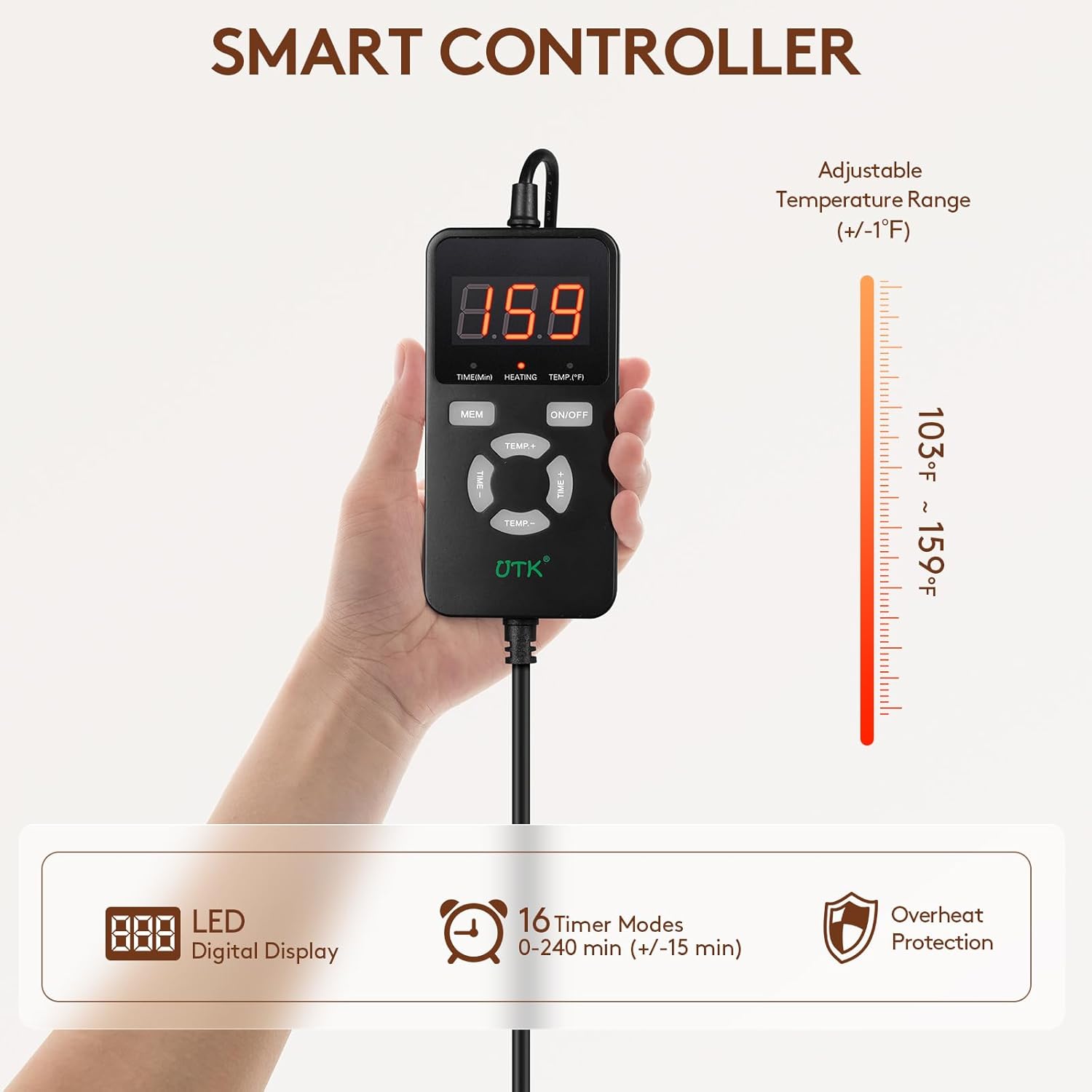 - 【Easy To Use】It uses a smart thermostat with a digital display. Multiple safety protections, one-button start and automatic memory functions are very friendly to the elderly. The design of multi-level temperature and time allows you to set your own exclusive heating mode more accurately. 57 temperature settings (+/- 1°F): 103-159°F. 24 time settings (+/- 15 min): 0-240 min
