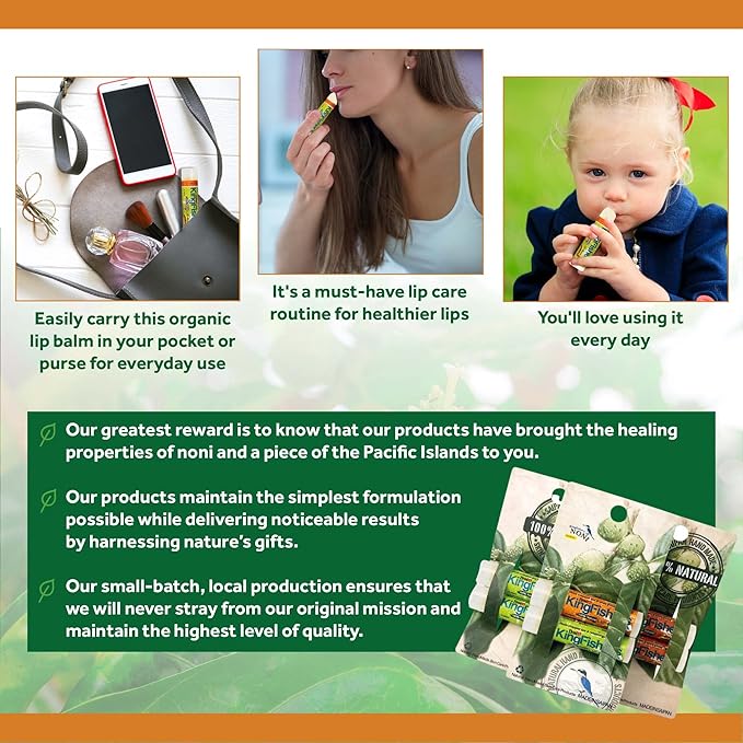 - 100% PURE ORGANIC LIP BALM: Formulated with Saipan Noni Oil and Extra Virgin Coconut Oil. These ingredients hydrate, nourish and protect your lips by locking in moisture to give you the healthiest lips.
