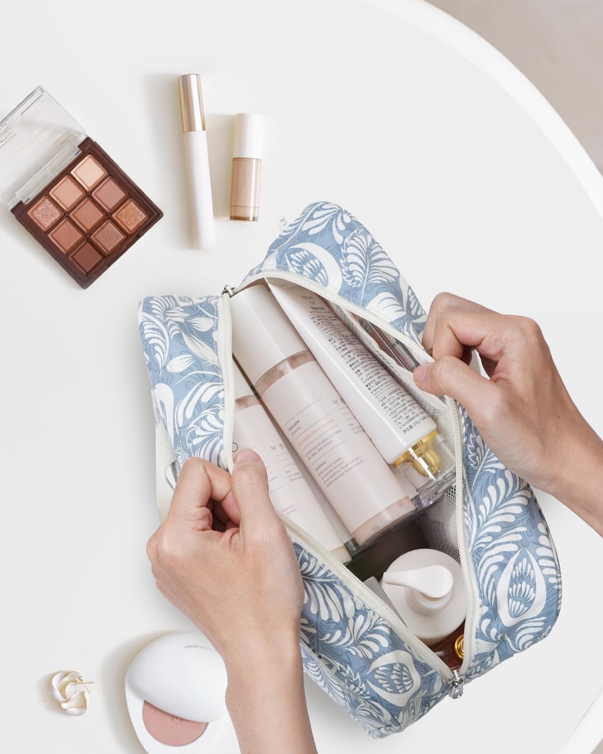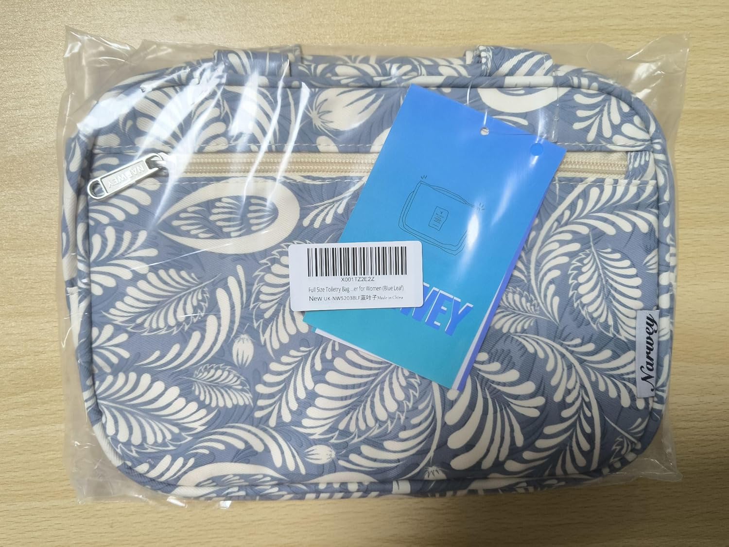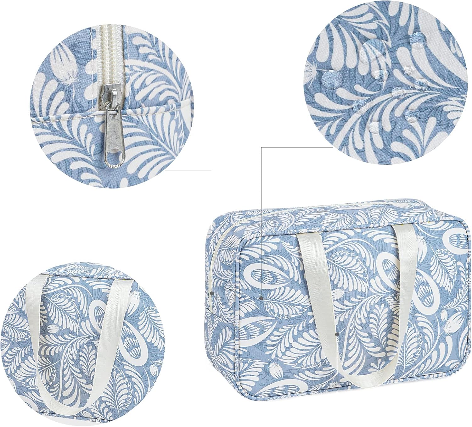 Full Size Toiletry Bag Women Large Cosmetic Bag Travel Makeup Bag Organizer Medicine Bag for Toiletries Essentials Accessories (Large, Blue Leaf)