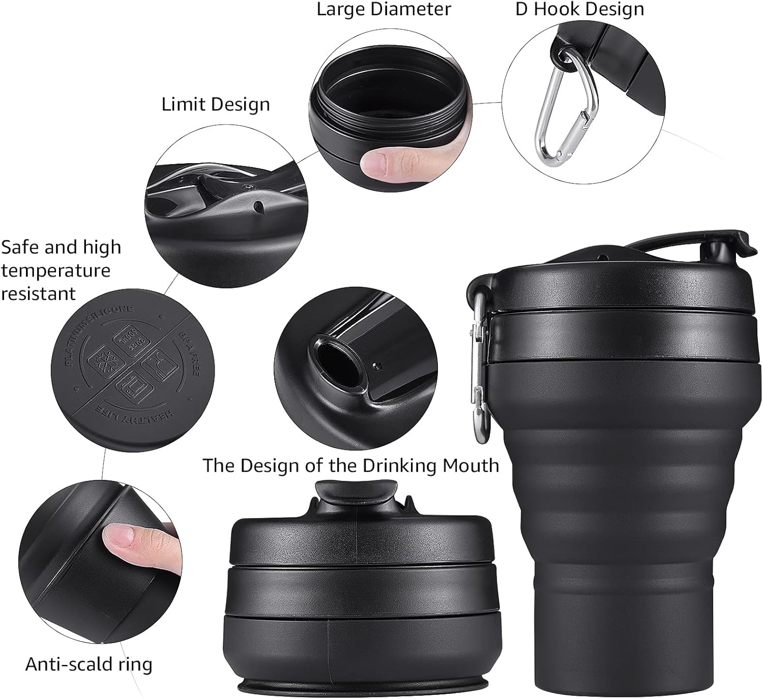 - [Safe Material Food Grade Silicone]- Our collapsible travel cup made of food grades silicone, No BPA. It added a anti-scald ring for safety. Besides. It is easy to clean, non-toxic, odorless, non-staining, durable, flexible & reusable, withstands temperature of -104℉ ~ 428℉. Safe and healthy for the whole family. It`s safer and larger than similar products in the market.