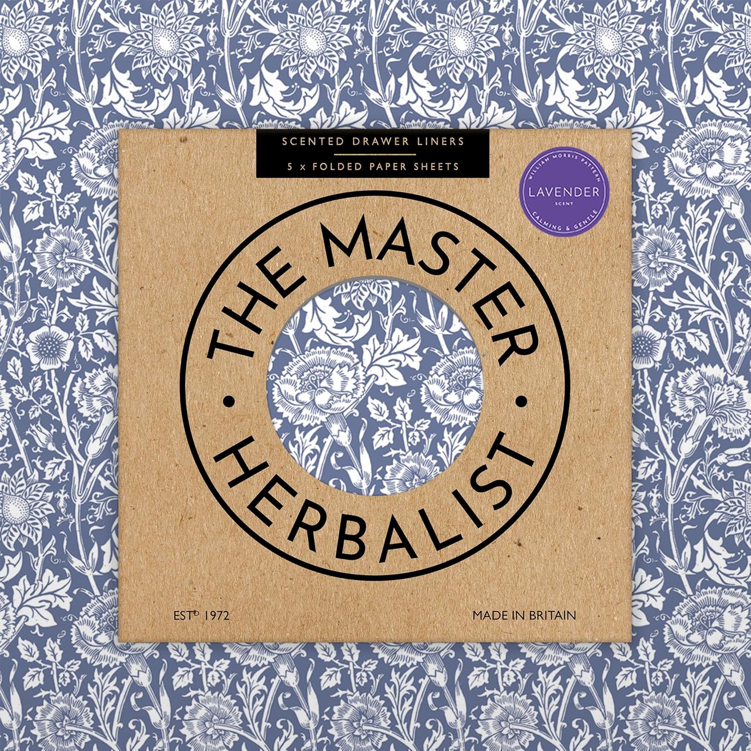 - NEW & IMPROVED FRAGRANCE Formulations: LAVENDER Scented Drawer Liners with Essential Oils in a BLUE William Morris Design. Gift Box of 5 large paper sheets (FOLDED) Vegan Friendly, Allergen Free. Made in the UK