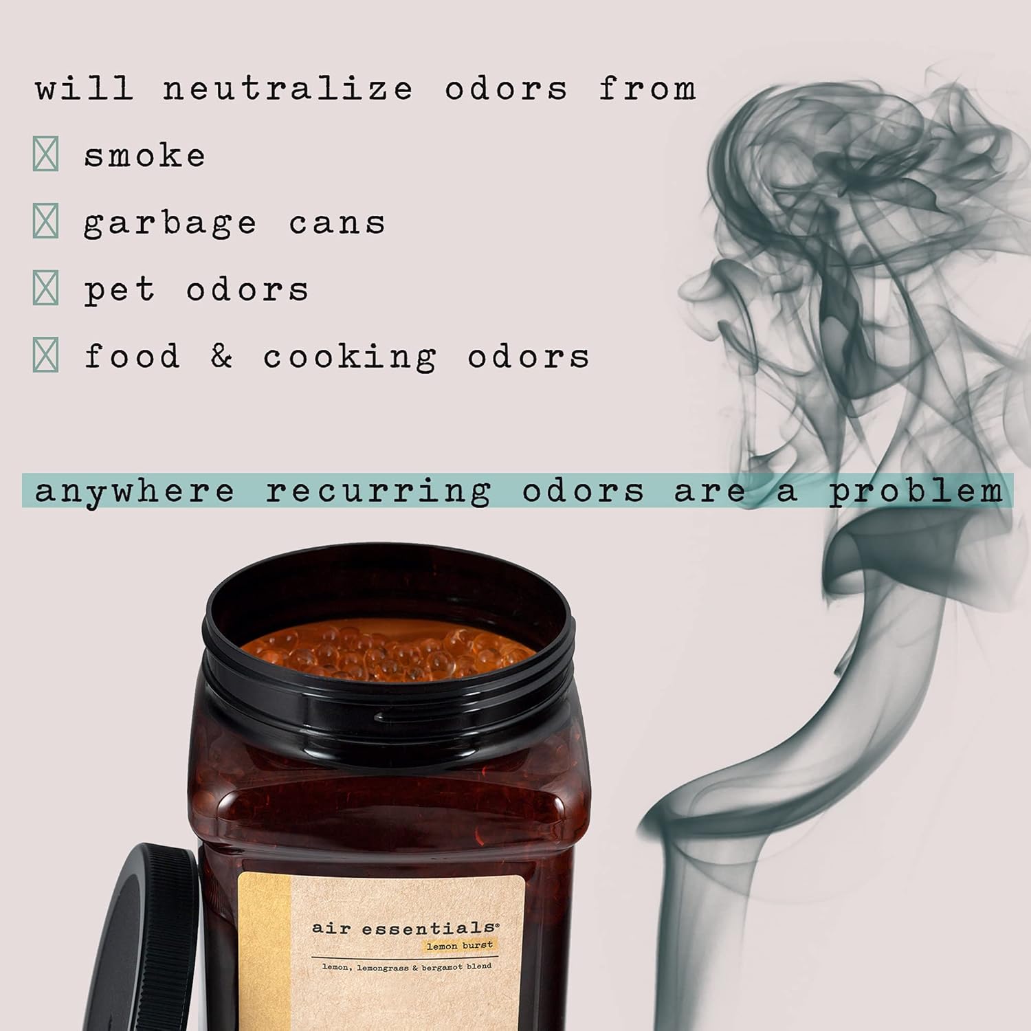 - NEUTRALIZE RECURRING ODORS - Freshen your home, office, car, RV, and boat safely with plant derived ingredients and pure essential oils. The Gel Beads will neutralize odors from smoke, garbage cans, pet areas, food, cooking and anywhere recurring odors are a problem. Pour the Gel Beads into an existing Air Essentials 12 ounce jar or your favorite vase or bowl for added decoration.