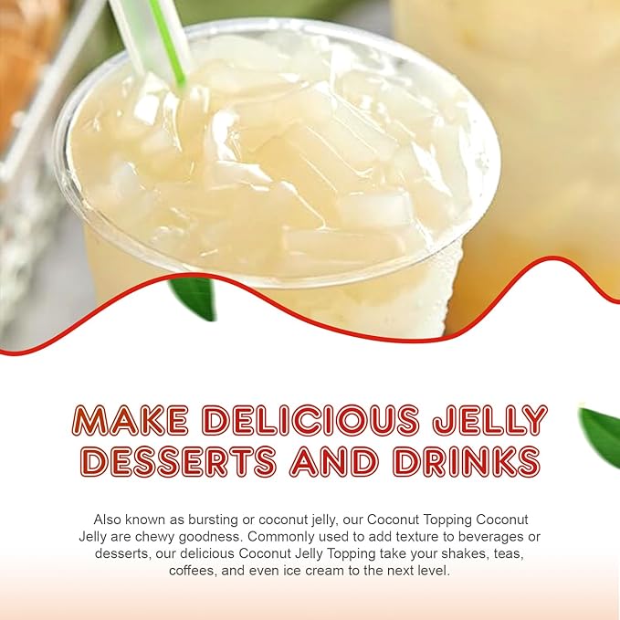 - 𝐔𝐧𝐢𝐪𝐮𝐞 𝐓𝐞𝐱𝐭𝐮𝐫𝐞: This coconut jelly topping has a jelly-like consistency thicker than gelatin, providing a unique and compelling texture for drinks and desserts. The coconut jelly with nata de coco distinct feel enhances the overall sensory experience of the beverages or dishes it's added to.