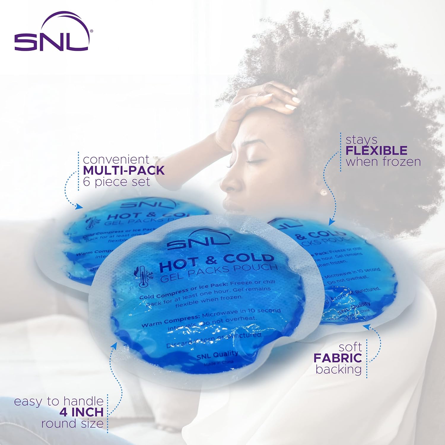 SNL Quality Hot & Ice Packs [6 Gel Packs], Reusable, Round, Soft Fabric Backing, for Breastfeeding, Pain Relief, First Aid - Includes: Wrap Sleeve for Hands-Free Application, Storage Bag