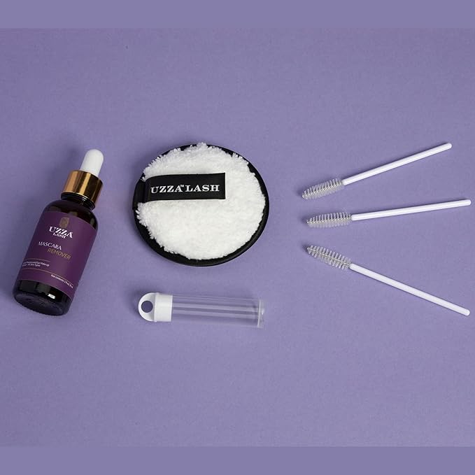 UZZA Lash Eye Makeup Remover - Waterproof Mascara Remover for Sensitive Eyes - Natural Make up Remover - Hygienic Kit Includes Eyelash Brush, Reusable Pads, Cleanser Liquid 1oz
