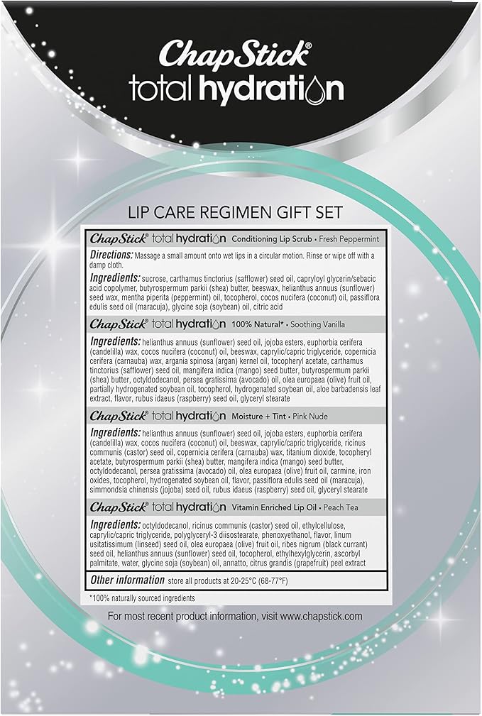- Gift pack includes: Fresh Peppermint ChapStick lip scrub, Peach Tea lip oil, ChapStick Total Hydration Soothing Vanilla moisturizing lip balm and ChapStick Pink Nude Hydration + Tint tinted lip balm