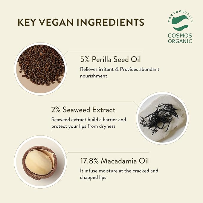 - Formulated with 93.4% organic ingredients, including cold-pressed perilla seed oil, coconut oil, olive oil and shea butter, lip balm comes in a rich yet quick-absorbent texture that melts instantly onto skin