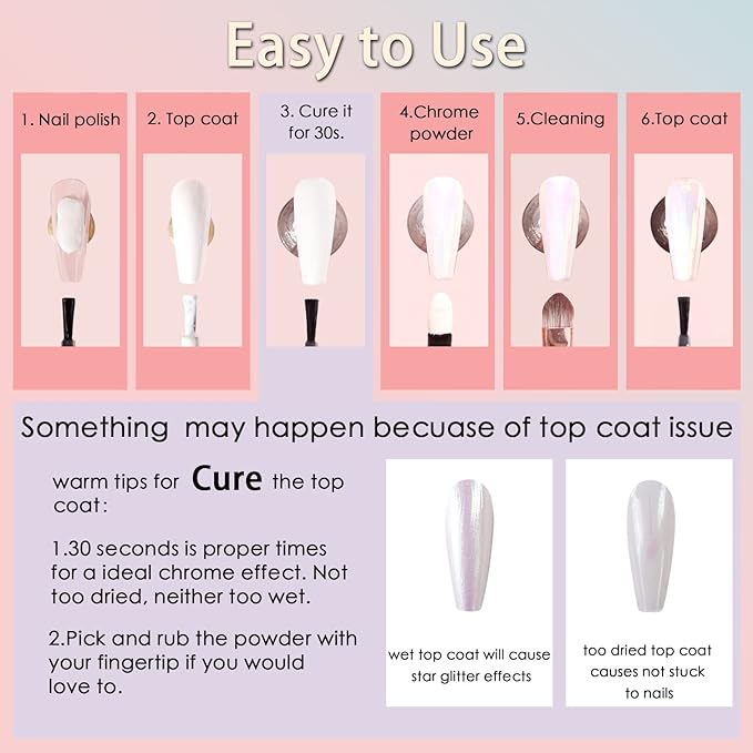 - Easy to Use: The chrome powder stuck well to the nails that applied No-wipe Top Coat. You can easily get salon-quality chrome results. To make it easy to use the powder, we provide detailed steps and tips in the images. Use it and try more DIY nails with chrome hearts nail charms, flatback rhinestones, and nail stickers.