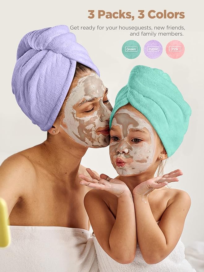 Hicober Microfiber Hair Towel, 3 Packs Hair Turbans for Wet Hair, Drying Hair Wrap Towels for Curly Hair Women Anti Frizz (Pink,Purple,Green)