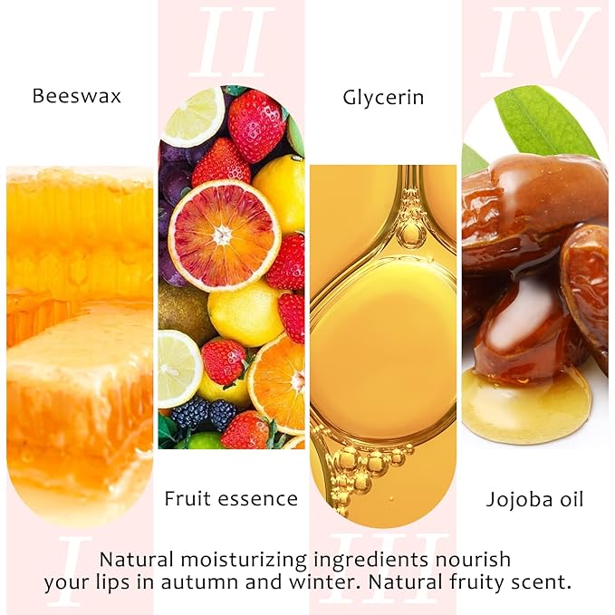 - 【All Natural Ingredients】Beeswax, glycerin, Jojoba oil fruit essence and other natural moisturizing ingredients nourish your lips in autumn and winter. Natural fruity scent. If you're on the fence, buy it. You won't be disappointed.