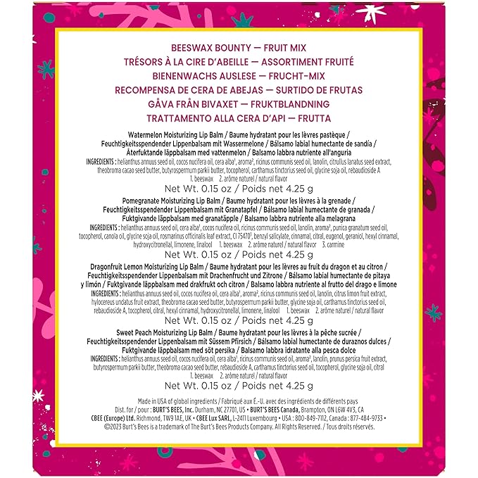 - FESTIVE PACKAGING: Each Burt’s Bees Lip Balm Gift Set contains four 0.15 oz. lip balm tubes in assorted fruit flavors with holiday-themed packaging that is great for gift baskets and stocking stuffers