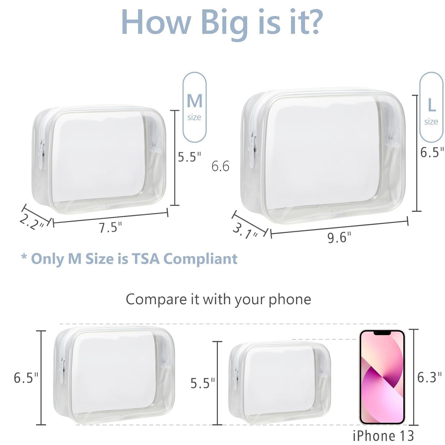 - TSA Approved, Meet Liquids Rule: The medium size clear makeup bag is 7.5 x 2.2 x 5.5 inch, it follows the TSA's 3-1-1 Liquid Rule published by TSA. You can quickly pass the airport security screening. Note: the large size clear bag is 9.6 x 3.1 x 6.5 inch, it is larger than one quart and is not TSA approved