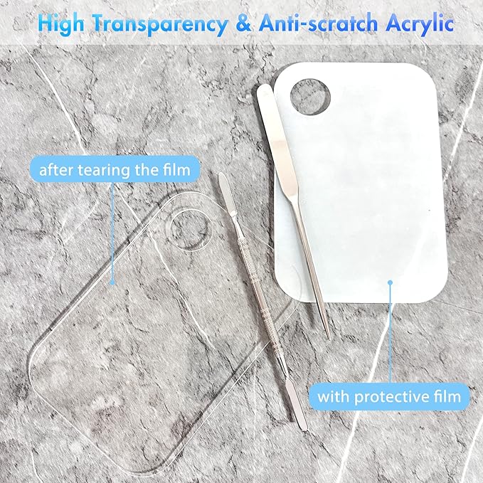- No Sharp Edge Makeup Mixing Tray: 100% brand new premium acrylic glass palette is highly transparent and convenient to check the color after mixing also can do its best to avoid injury as no sharp edges like metal.