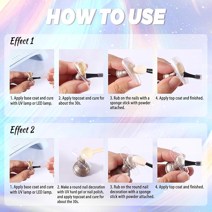 - Fantasy Chameleon Effect: The holographic nail pigment is colorful. Except for the original color of the powder, you can also see different color-changing effect from different angles. It is recommended to use the black gel or opal gel as base, which can better reflect the effect of the iridescent glitter color. Bring you a different feeling.