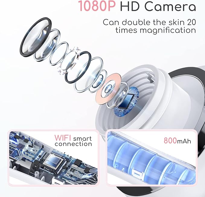 - 【HD Camera & LED Lighting】Built-in 1080P HD camera magnifies skin up to 20 times; eight adjustable LED lights enhance visibility; supports photo and video recording