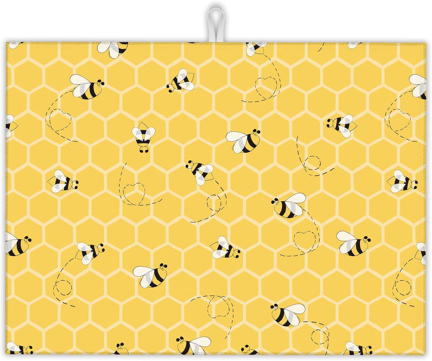 Yellow Bees Dish Drying Rack Mats Decor,Honey Honeycombs Dish Pad Drying Mat Kitchen Counter 18x24 Inch Absorbent Reversible Microfiber for Coffee Bar Sink Countertop