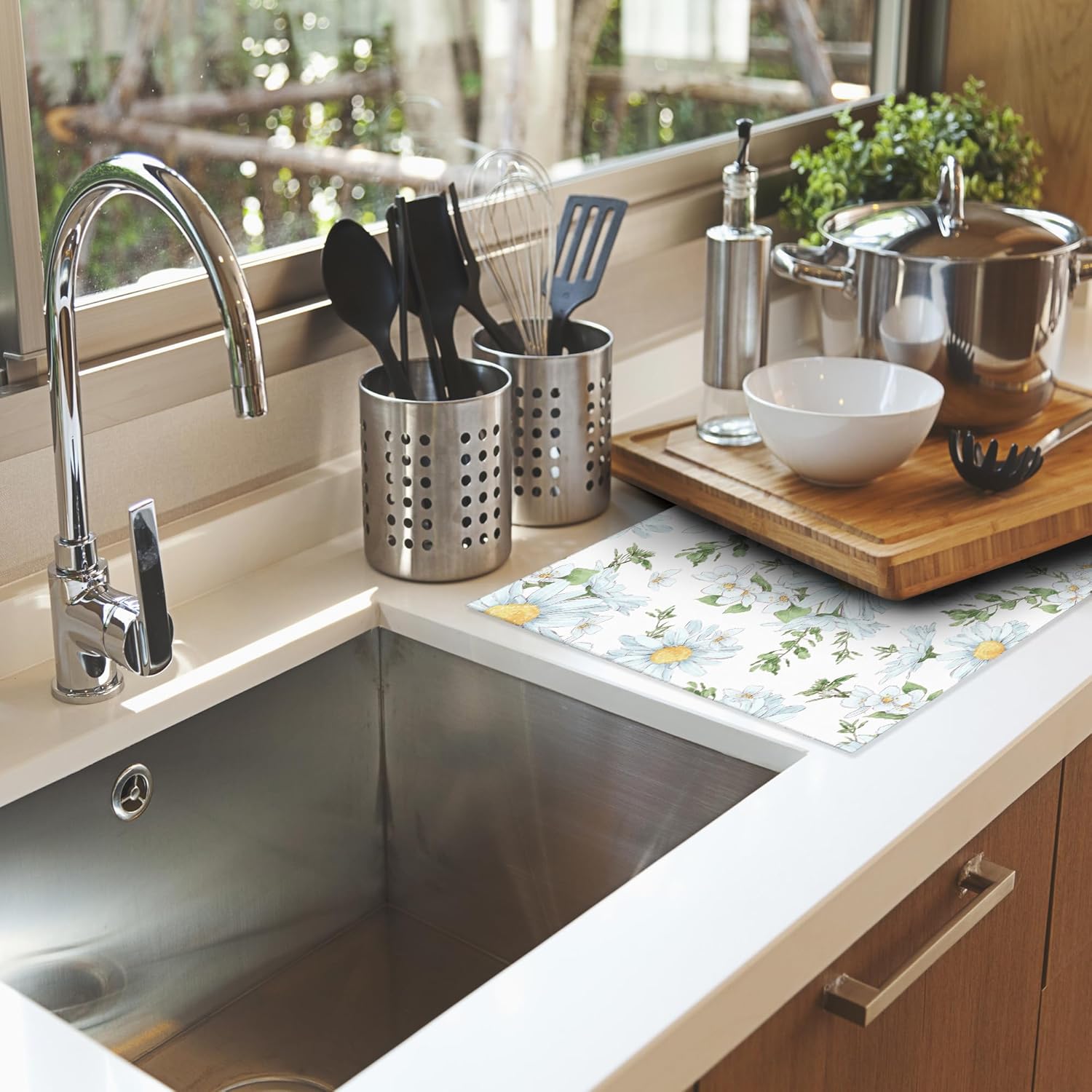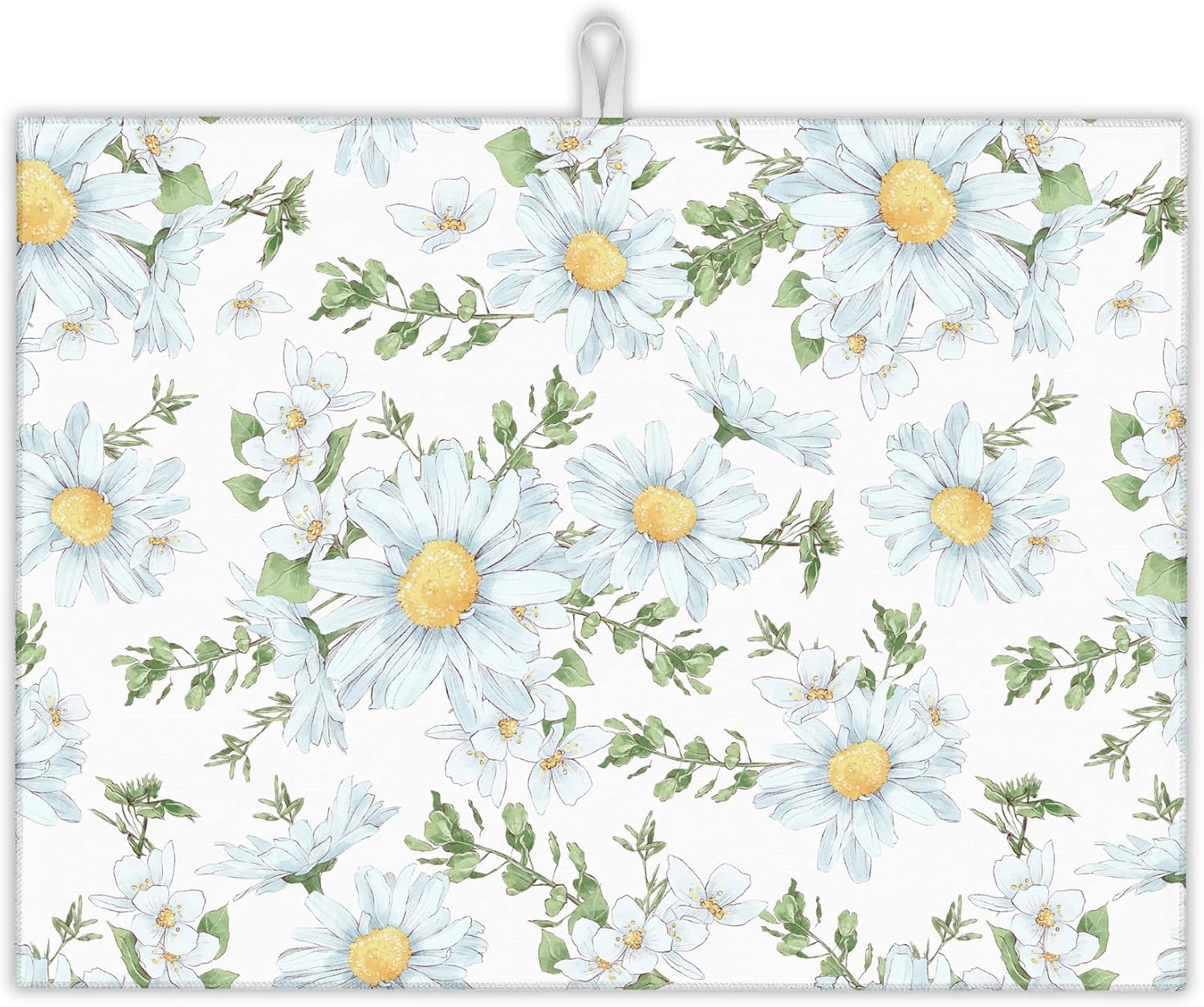 White Chamomile Flowers Dish Drying Rack Mats Decor, Dish Pad Drying Mat Kitchen Counter 18x24 Inch Absorbent Reversible Microfiber for Coffee Bar Sink Countertop
