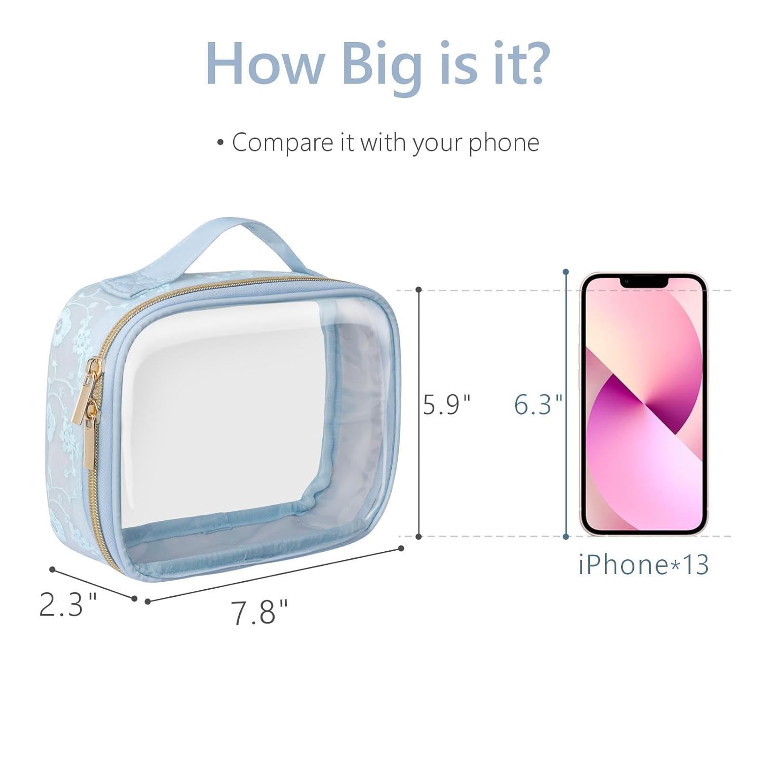 - TSA Approved, Meet Liquids Rule: The medium size clear makeup bag is 7.8 x 2.3 x 5.9 inch, it follows the TSA's 3-1-1 Liquid Rule published by TSA. You can quickly pass the airport security screening. High-quality metal zipper is smooth not get stuck