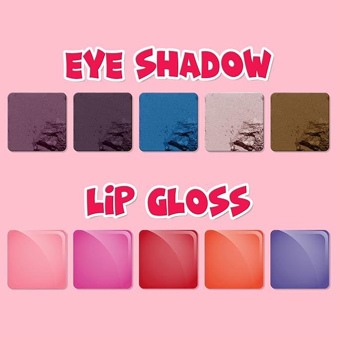 - KIT INCLUDES: 5-well eyeshadow of bright colors. 4 peelable, bubble gum scented nail polishes, 1 blush compact, 3 lip glosses scented in grape, cherry, and cotton candy, 1 cotton candy 5-well lip gloss, 2 roll-on lip glosses, flavored grape and cotton candy, 2 scrunchies, 1 hair bow, other hair accessories, 2 toe spacers, 1 nail and other nail accessories.