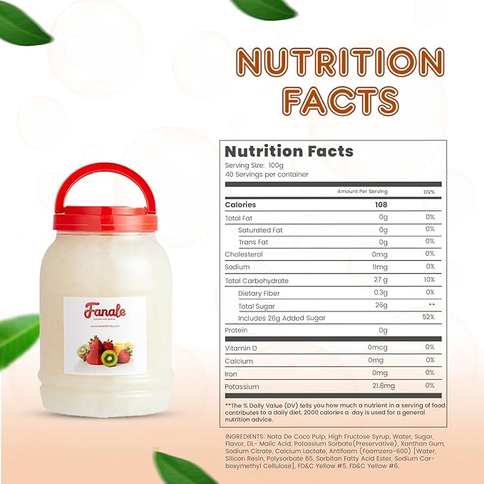 - 𝐍𝐮𝐭𝐫𝐢𝐭𝐢𝐨𝐮𝐬 𝐈𝐧𝐠𝐫𝐞𝐝𝐢𝐞𝐧𝐭𝐬: Our nata de coco jelly topping is made from the inner layer of coconut meat, making it delicious and nutritious. The coconut boba tea jelly topping retains many vitamins, minerals, and fiber inherent to coconut, making it a healthier option than many artificial or processed toppings.