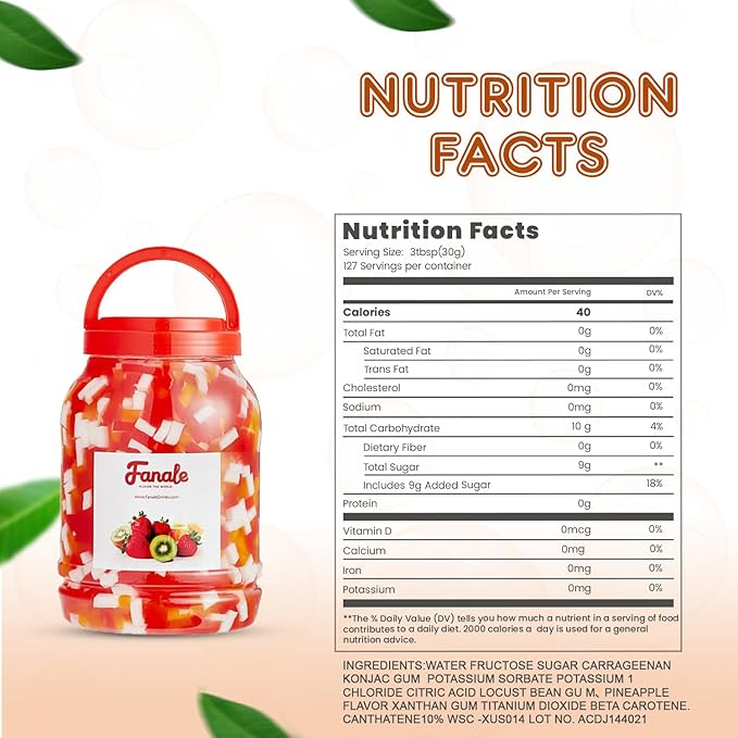 - 𝐒𝐰𝐞𝐞𝐭 𝐚𝐧𝐝 𝐄𝐱𝐨𝐭𝐢𝐜 𝐅𝐥𝐚𝐯𝐨𝐫: Each Fanale coconut jelly boba tea variety is infused with sweet and exotic flavors that complement a range of recipes. This nata de coco jelly topping includes strawberry, lychee, blueberry, mango, sakura, green apple, coconut, Konjac, and coffee flavors, adding a distinct and delightful twist to your creations.