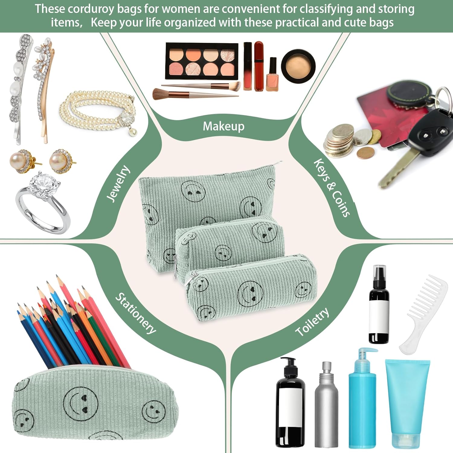 3 Pcs Makeup Bag Set for Women Corduroy Cosmetic Pouch Aesthetic Smile Travel Toiletry Bag Cute Purse Pouch Pencil Case Makeup Brushes Storage Organizer for Christmas(Green,Smile Face)