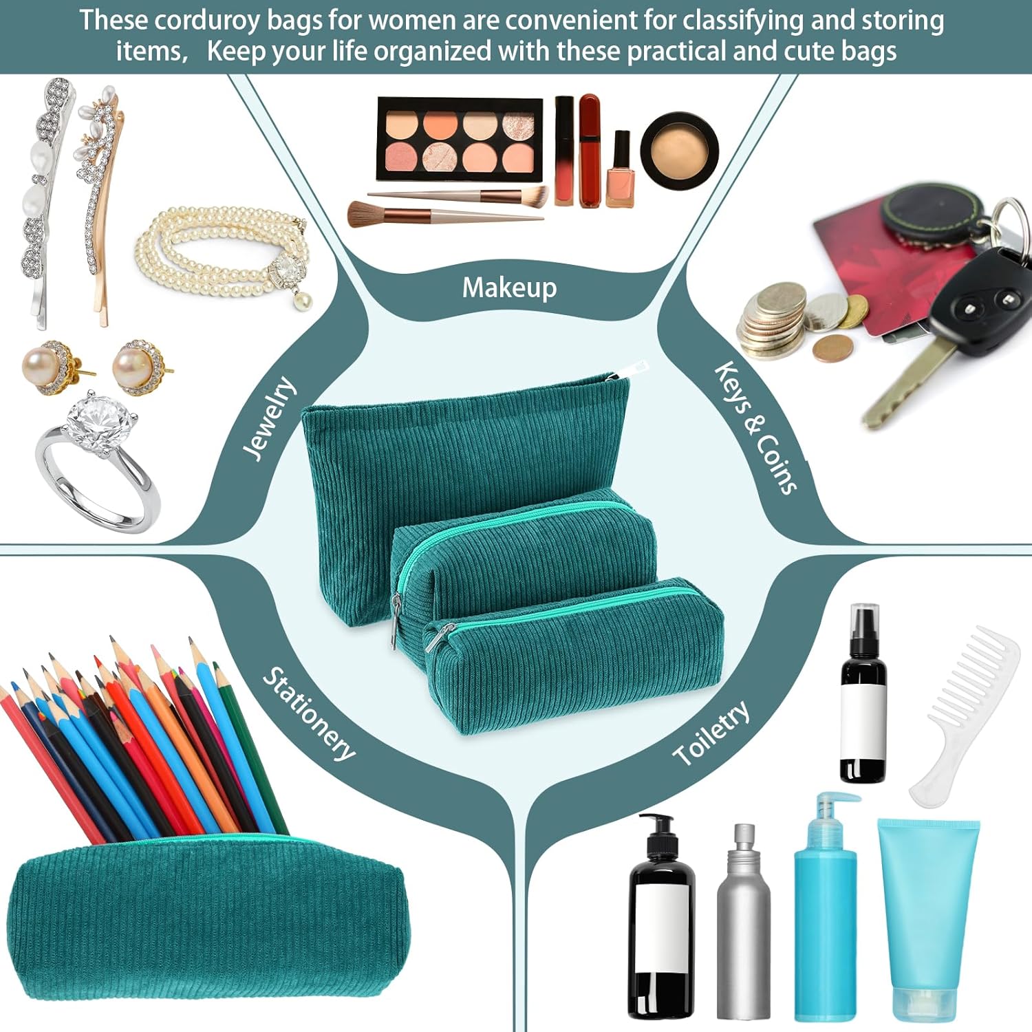 3 Pcs Makeup Bag Set for Women Corduroy Cosmetic Pouch Aesthetic Smile Travel Toiletry Bag Cute Purse Pouch Pencil Case Makeup Brushes Storage Organizer for Christmas(Dark Green,Solid Style)
