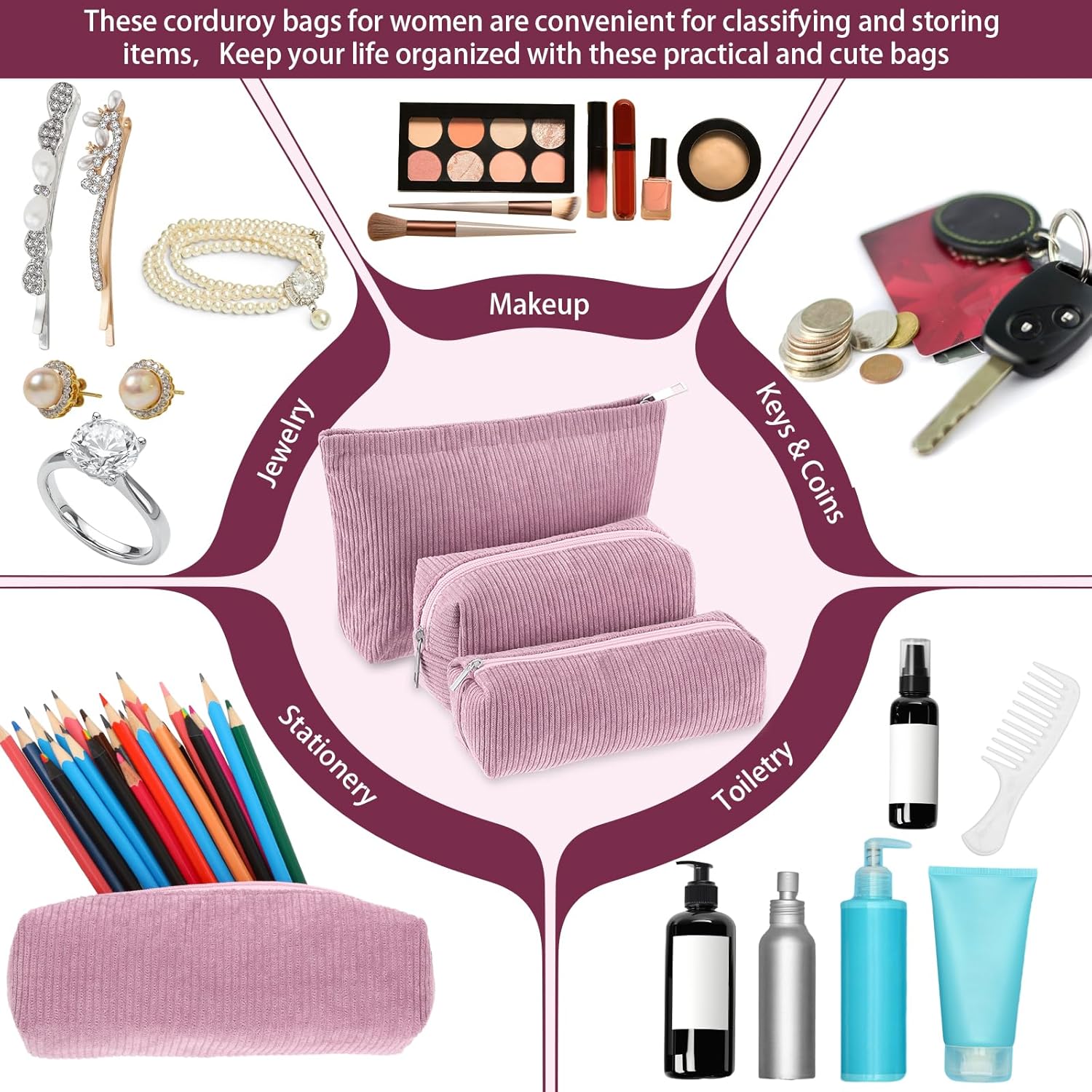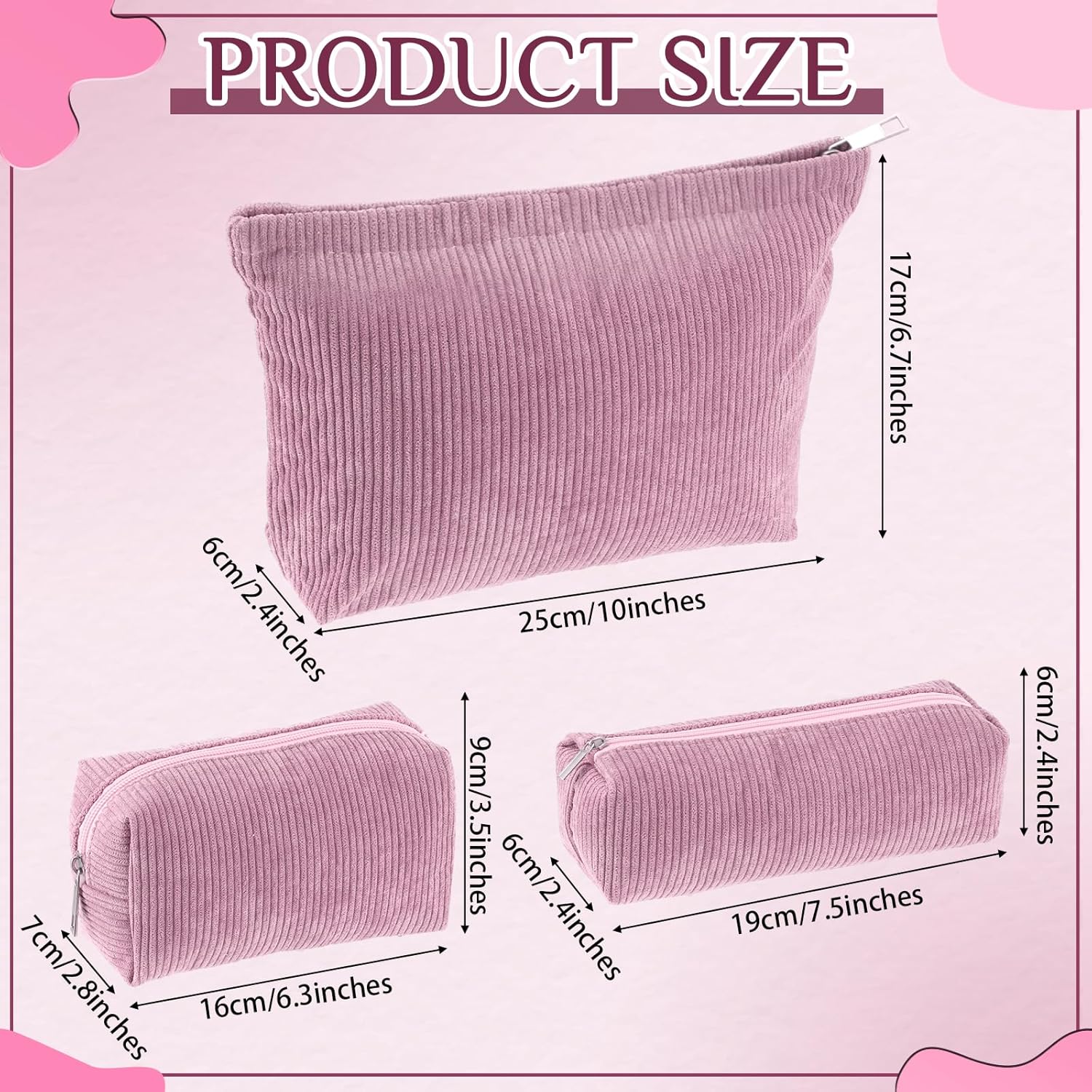 3 Pcs Makeup Bag Set for Women Corduroy Cosmetic Pouch Aesthetic Smile Travel Toiletry Bag Cute Purse Pouch Pencil Case Makeup Brushes Storage Organizer for Christmas(Rose Pink,Solid Style)
