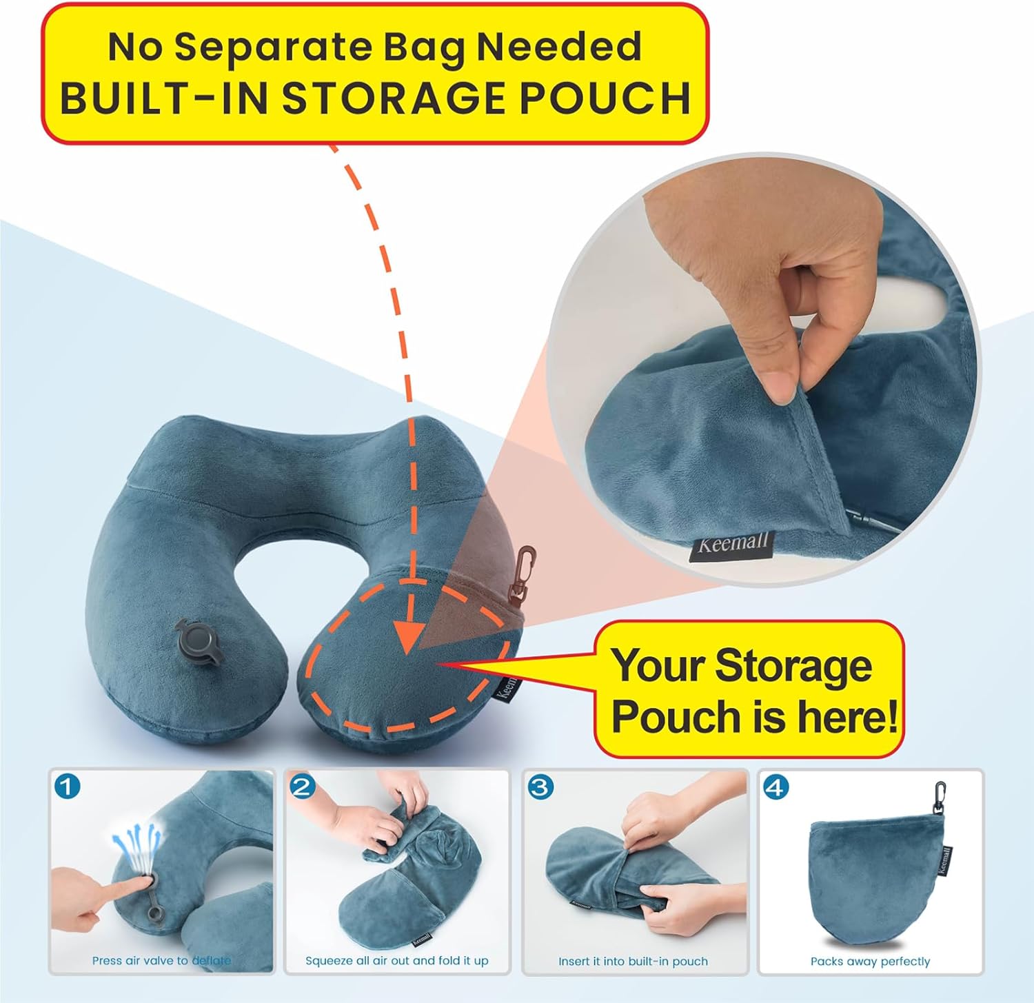- Quick Inflation and Deflation: It inflates and deflates very easily. It folds into its own pocket ,which enabling you to set up or pack away the pillow quickly and efficiently, saving time and effort.