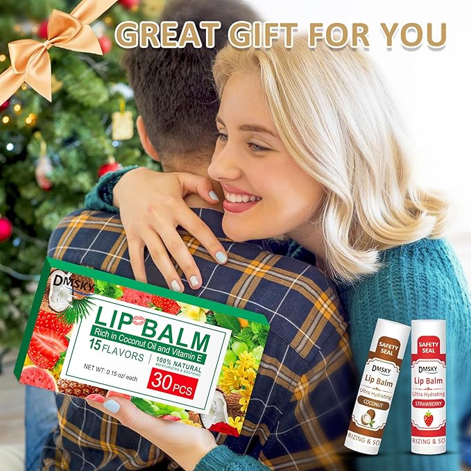 DMSKY 30 Pack Lip Balm, Natural Lip Balm Bulk with Vitamin E and Coconut Oil, Moisturizing Soothing Chapped Lips-15 Flavors