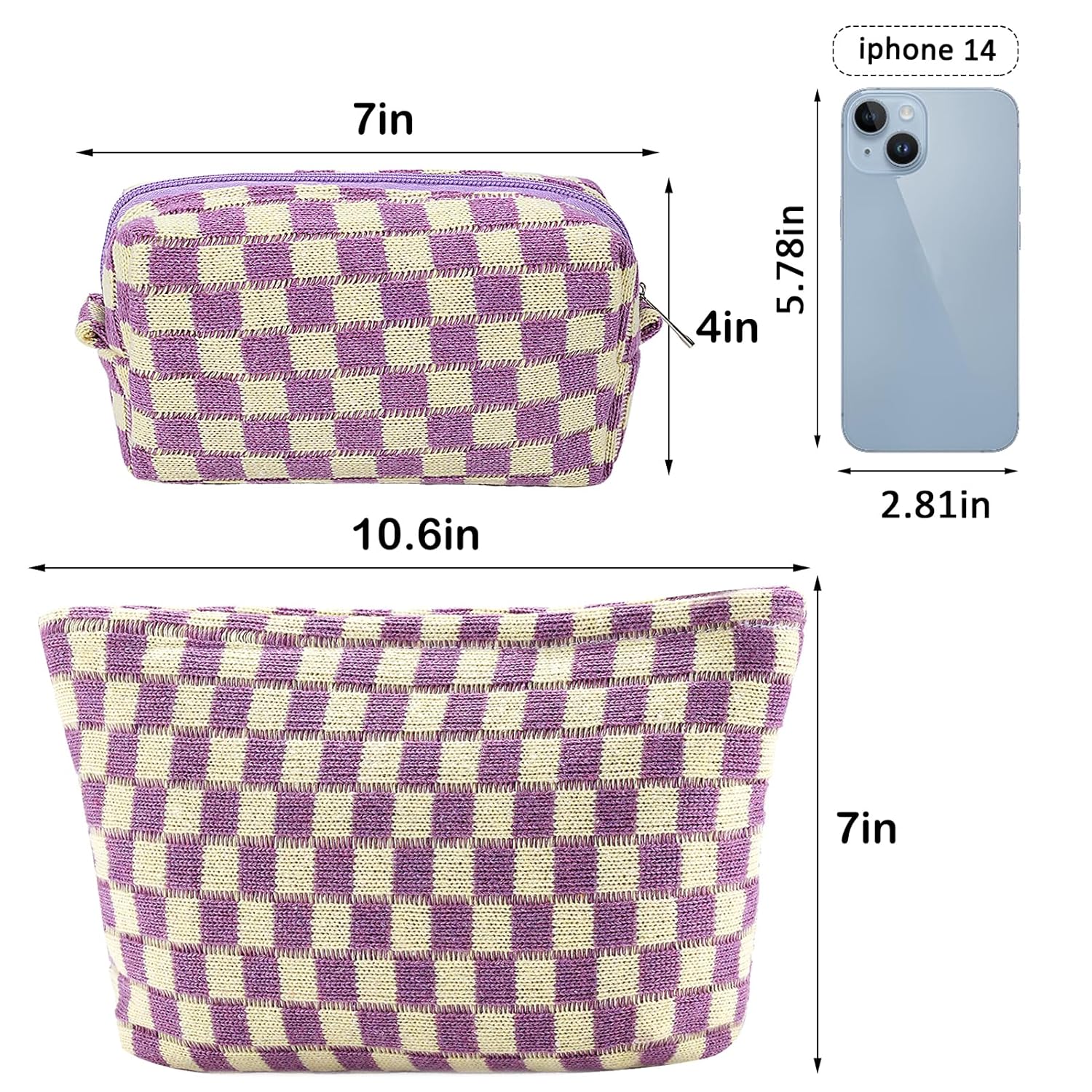 - LARGE CAPACITY AND PREMIUM MATERIAL: The cute makeup bag measure 10.6×7 inches and 7×4 inches, easy to carry. The checkered makeup bag is made of soft knitted fabric, easy to clean. The smaller ones can be used as pencil case or pencil pouch. This makeup travel bag can also hold small items such as makeup, skincare products, lipstick, eye shadow, eyebrow brush, etc. Makeup storage bag for women toiletries