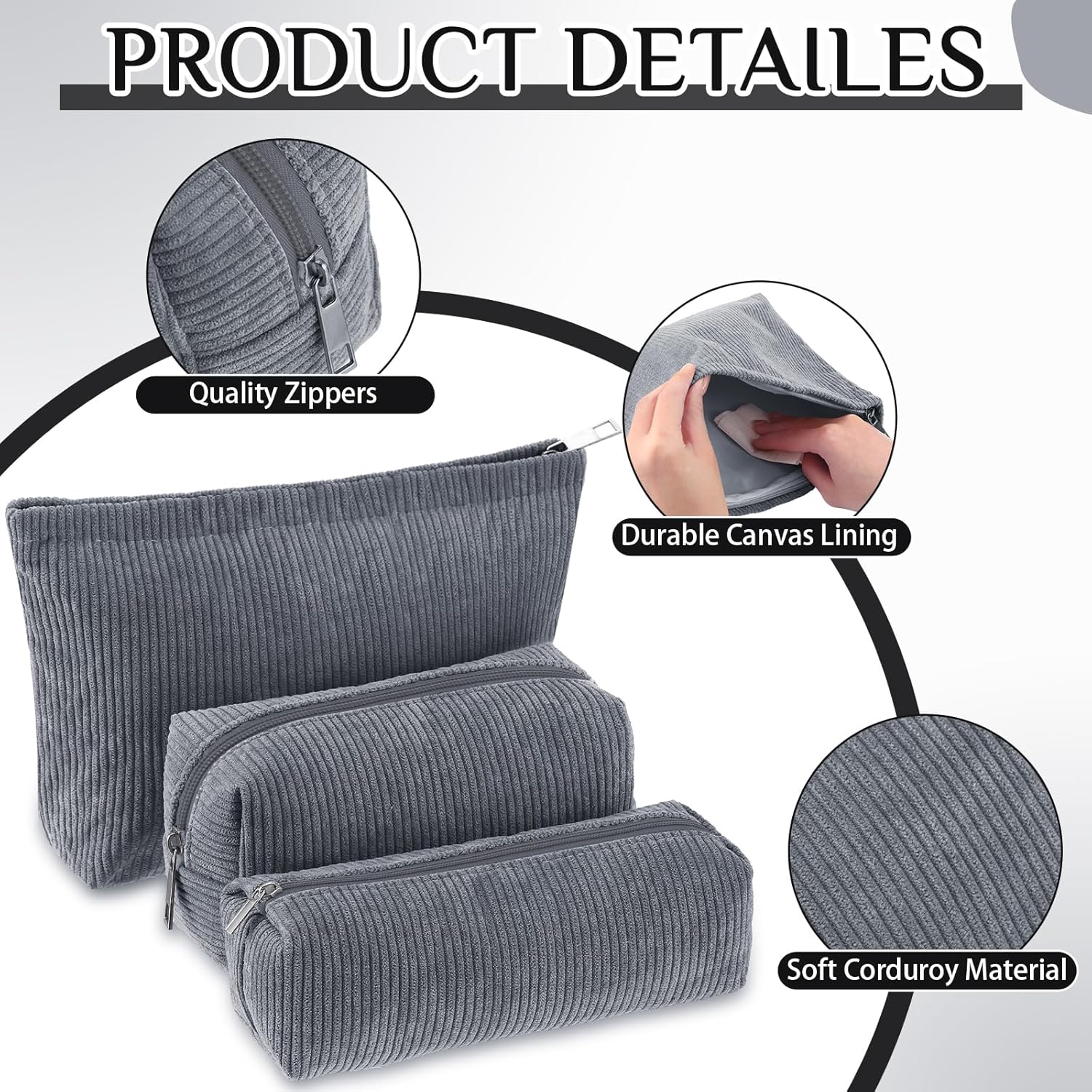 3 Pcs Makeup Bag Set for Women Corduroy Cosmetic Pouch Aesthetic Smile Travel Toiletry Bag Cute Purse Pouch Pencil Case Makeup Brushes Storage Organizer for Christmas(Gray,Solid Style)