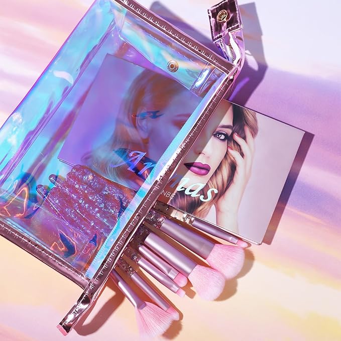 - ►.7 pcs full size versatile makeup brushes with shimmering handle, perfect for face & body application. Multifunctional and can be used around the eyes, cheeks, nose and jawline blending and shading. This laser pink makeup bag is made of premium quality PVC, lightweight and durable, it can store all your daily makeup essentials with this bag. Neatly organize your daily makeup items with this lovely bag. The bag size is 8.8” (L) x 5.3” (W) x 2.55” (H).