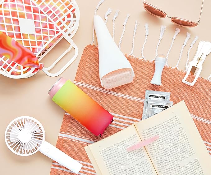 - STAY COOL & SWEAT FREE – It comes with 2 different facial rollers – a refreshing ice roller to keep you cool & an oil-absorbing roller to stay dry! We have also included a cute, mini rechargeable fan for on-the-go or just for lounging & our cute slim can cooler ties it all together!