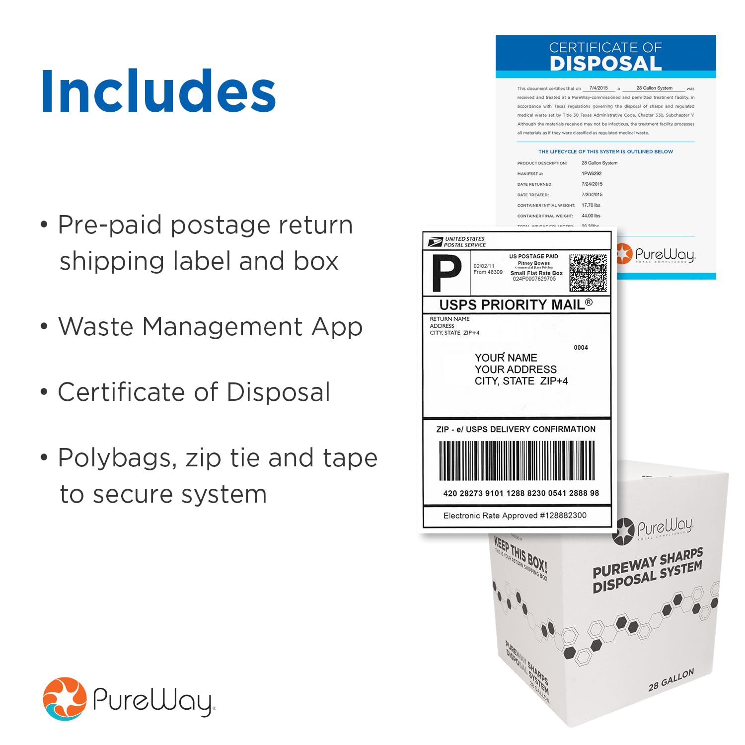 - PREPAID RETURN LABEL: Sharps Kit Includes 8 Gallon Medical sharps container, Mail Back Box, Prepaid return label, an online portal with compliance tracking, and certificate of destruction.