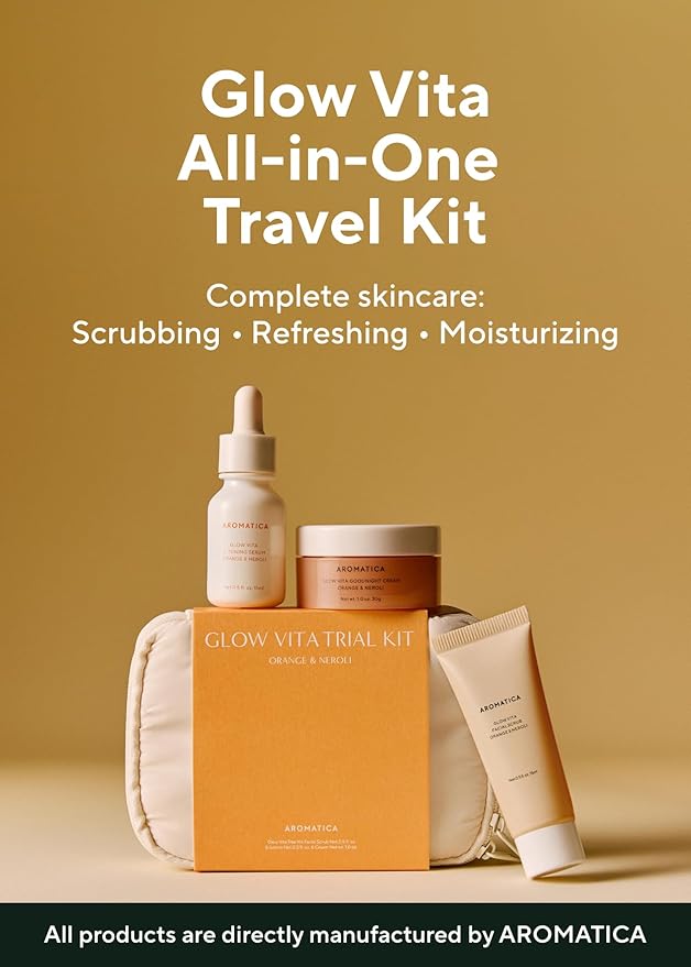 AROMATICA Glow Vita Trial Kit - Travel Size Skin Care Set [Vitamin C Serum 0.5 fl.oz, Facial Scrub 0.5 fl.oz, Goodnight Cream with Retinol 1oz] - Travel Kit for Women